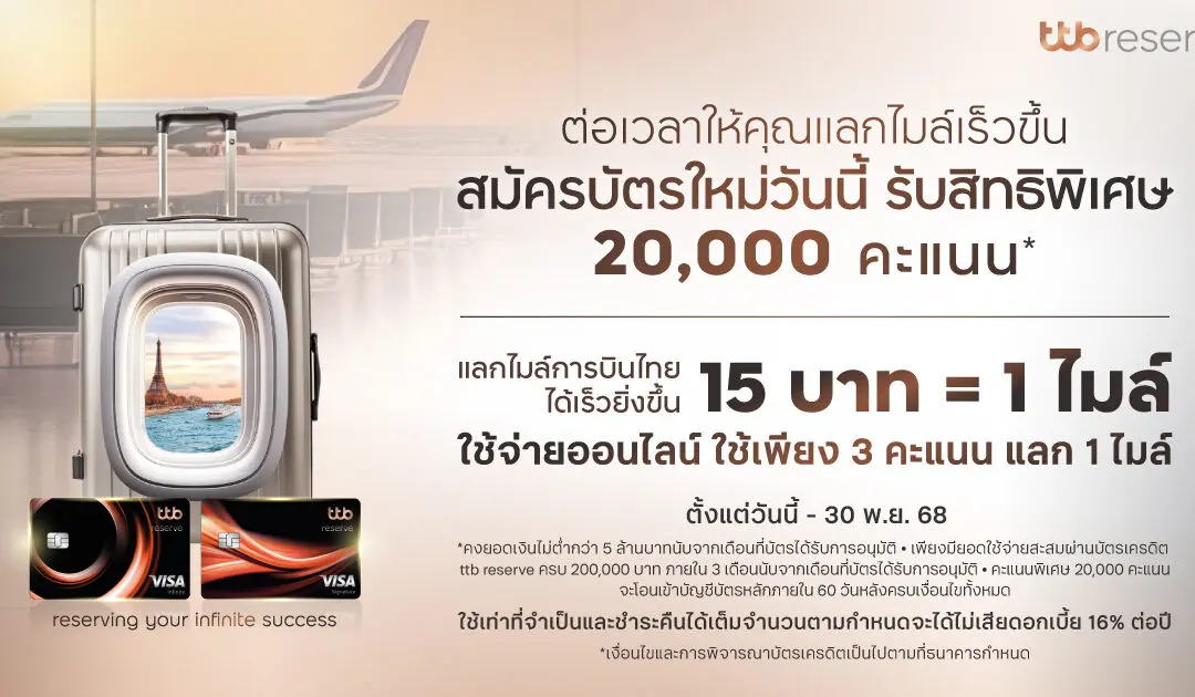 กรุงเทพฯ, 14 พฤศจิกายน 2568 – ทีเอ็มบีธนชาต หรือ ทีทีบี เดินหน้ามอบสิทธิประโยชน์เหนือระดับให้กับกลุ่มลูกค้า Wealth ขยายระยะเวลาโปรโมชัน “แลกไมล์เร็วยิ่งขึ้น” สำหรับผู้สมัครบัตรเครดิต ttb reserve เพื่อให้ลูกค้าสะสมไมล์ได้เร็วกว่าเดิม พร้อมรับคะแนนพิเศษ 20,000 คะแนน* เมื่อสมัครบัตรเครดิตใหม่ภายในวันที่ 30 พฤศจิกายน 2568