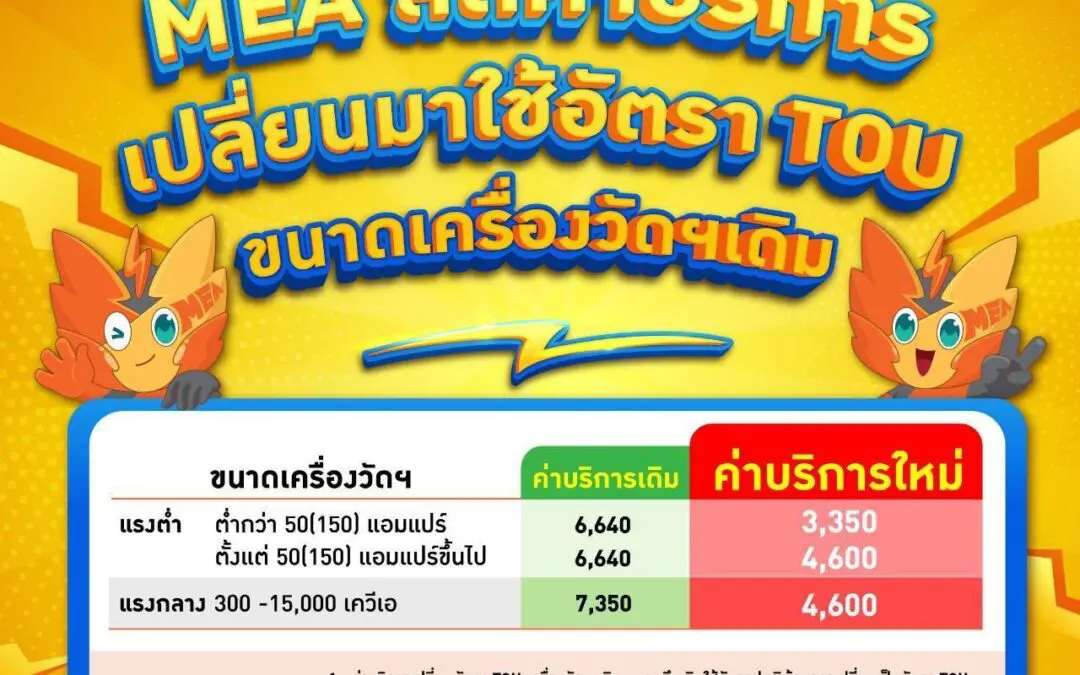MEA หรือ การไฟฟ้านครหลวง ลดค่าบริการขอใช้ไฟฟ้าอัตรา TOU โดยมีค่าบริการใหม่ ดังนี้