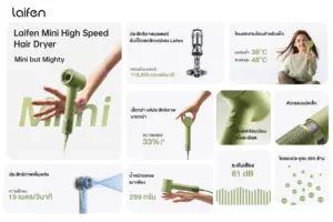 ไดร์เป่าผมความเร็วสูง ขนาดเล็กกว่าที่เคย พกพาไปได้ทุกที่ ด้วยตัวเครื่องเล็กมีน้ำหนักเบาเพียง 299 กรัม โดดเด่นด้านประสิทธิภาพที่เป็นเอกสิทธิ์เฉพาะของไลเฟ่น โดยมอเตอร์สามารถหมุนได้เร็วถึง 110,000 รอบต่อนาที และให้ความเร็วลมสูงสุดถึง 19 เมตรต่อวินาที การออกแบบนี้ไม่เพียงแต่ช่วยให้ลมไหลเวียนแรงขึ้นเท่านั้น แต่ยังทำให้ผมแห้งเร็วภายใน 5 นาทีอีกด้วย เทียบเท่าไดร์เป่าผมขนาดใหญ่ แต่ไร้ซึ่งเสียงรบกวน LAIFEN MINI มาพร้อมระบบควบคุมความอุณภูมิอัจฉริยะที่เป็นคุณสมบัติโดดเด่นคือ มีโหมดความร้อนพิเศษสำหรับเด็ก ด้วยการตั้งค่าอุณหภูมิที่ปลอดภัยขึ้น ช่วยป้องกันเส้นผมและหนังศีรษะที่บอบบางของเด็ก LAIFEN MINI ยังมีดีไซน์สวย ล้ำสมัย ที่ออกแบบด้ามจับให้มีขนาดเล็กขึ้น ช่วยให้จับได้สบายมือ เพิ่มประสิทธิภาพทั้งด้านการมองเห็นและการสัมผัส มี 4 สีให้เลือก ได้แก่ Matcha Green, Sakura Pink, Baby Blue และ Milky White และด้วยการออกแบบที่เบาและกะทัดรัด LAIFEN MINI จึงถือเป็นอีกหนึ่งตัวเลือกที่ดีของไดร์เป่าผมสำหรับนักเดินทาง สามารถใส่ในกระเป๋าเดินทางหรือกระเป๋าถือได้อย่างง่ายดาย สะดวกสำหรับทั้งการเดินทางเพื่อธุรกิจและการพักผ่อน LAIFEN MINI พร้อมจำหน่ายในประเทศไทยแล้ววันนี้ ในราคา 3,299 บาท ผ่านช่องทาง Shopee, Lazada, Tiktok และเตรียมพบกับ ไลเฟ่น ออฟไลน์สโตร์ เร็ว ๆ นี้