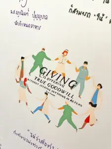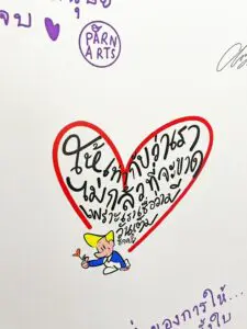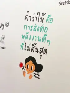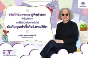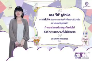 “ครูทำงานกับมูลนิธิรามาธิบดีฯ มาเป็นสิบปีจากความรู้สึกว่า ‘อยากช่วยบ้าง’ แล้วมันก็กลายเป็นความสุขที่ทำต่อเรื่อย ๆ งานของครูยืนอยู่บนความเชื่อว่า ชีวิตที่ดีเริ่มจากการรู้จักตัวเอง ทำในสิ่งที่รัก และใช้สิ่งนั้นช่วยคนอื่นได้ มันคือคุณค่าที่แท้จริงของชีวิต สำหรับครู การให้คือบทเรียนแรกของมนุษย์ เรามีแล้วเราไม่แบ่งปันก็ไม่น่ารัก เวลาเห็นคนใช้ของที่ออกแบบจริง ๆ ไม่ว่าจะเป็นถุงผ้าไม่กี่สิบบาทหรือของใช้เล็ก ๆ น้อย ๆ มันคือความหมายของศิลปะที่เข้าถึงคนทุกกลุ่ม”
