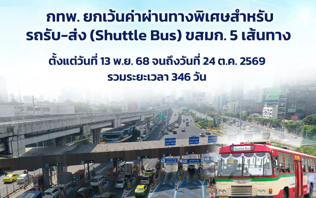 โดยจะยกเว้นค่าผ่านทางพิเศษสำหรับรถรับ-ส่งขสมก วันที่ 13 พฤศจิกายน 2568 ในวันที่ 24 ตุลาคม 2569 รวมระยะเวลา 346 วันที่ขสมก. จะจัดรถ Shuttle Bus วันละ 400 เที่ยวรวมค่าผ่านทางที่กทพ. สามารถรับประทานได้ตลอดระยะเวลาดังกล่าวเป็นเงินจำนวน 11,902,400.- บาท