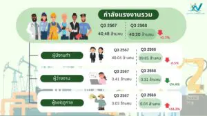 ดร. เอกพงษ์ หริ่มเจริญ ผู้อำนวยการสำนักงานสถิติแห่งชาติ เปิดเผยสถานการณ์แรงงานในไตรมาส 3 ปี 2568 พบมีจำนวนประชากรอายุ 15 ปีขึ้นไป 59.49 ล้านคน เป็นผู้ที่อยู่ในกำลังแรงงาน 40.20 ล้านคน หรือคิดเป็นร้อยละ 67และที่เหลืออยู่นอกกำลังแรงงานประมาณ 19.29 ล้านคน หรือคิดเป็นร้อยละ 32.4 จากกำลังแรงงานรวม 40.20 ล้านคน มีผู้ว่างงาน จำนวน 3.1 แสนคน ผู้รอฤดูกาล จำนวน 4.0 หมื่นคน และเป็นผู้มีงานทำ จำนวน 39.85 ล้านคน โดยแบ่งเป็นผู้มีงานทำในภาคเกษตรกรรม 11.86 ล้านคน ซึ่งลดลงร้อยละ 2.9 และผู้มีงานทำนอกภาคเกษตรกรรม 27.99 ล้านคน ภาพรวมเพิ่มขึ้นร้อยละ 0.6 หรือประมาณ 1.6 แสนคน เมื่อเทียบกับไตรมาสเดียวกันของปีก่อนหน้า โดยเฉพาะกลุ่มกิจกรรมด้านบริการอื่น ๆ ที่มีการขยายตัวในเกณฑ์สูงถึงร้อยละ 11.2 กลุ่มการขนส่งและสถานที่เก็บสินค้าที่ยังคงมีการขยายตัวอย่างต่อเนื่อง เพิ่มขึ้นร้อยละ 4.9และอีกกลุ่มที่น่าสนใจ คือ กลุ่มการผลิตที่มีการขยายตัวเพิ่มขึ้นเช่นเดียวกัน ในขณะเดียวกันมีหลายอุตสาหกรรมที่มีผู้มีงานทำลดลง ด้วยปัจจัยทางด้านเศรษฐกิจโดยรวมมีภาวะชะลอตัว ทำให้บริษัทลดการจ้างงาน มีการปรับเปลี่ยนเทคโนโลยีใหม่ ๆที่ลดความต้องการแรงงานเพื่อควบคุมต้นทุน รวมทั้งการลงทุนในโครงการใหม่ ๆ ของภาคเอกชนที่ลดลง ซึ่งส่งผลต่อความต้องการแรงงาน โดยเฉพาะกลุ่มการก่อสร้าง และ กลุ่มกิจกรรมอสังหาริมทรัพย์เป็นกลุ่มที่มีคนทำงานลดลงเป็นจำนวนมาก