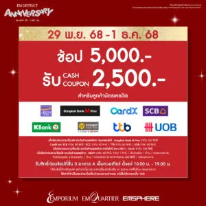 EM DISTRICT ANNIVERSARY UNSTOPPABLE HAPPINESS UNMISSABLE REWARDS มอบความพิเศษฉลองโอกาสครบรอบ 2 ปี พร้อมหลากหลายสิทธิพิเศษสุดเอ็กซ์คลูซีฟตลอด 4 วันเต็ม ระหว่างวันที่ 28 พฤศจิกายน 2568 – 1 ธันวาคม 2568 โดยการนำคะแนนจากพันธมิตรธุรกิจกว่า 23 พันธมิตรที่ร่วมแคมเปญ 20 คะแนน แลกรับของสมนาคุณ หรือเมนูฟรีจากร้านอาหารชั้นนำในศูนย์การค้ามากมาย”