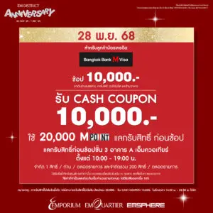 ในส่วนของ ห้างสรรพสินค้าเอ็มโพเรียม, เอ็มควอเทียร์ และ เอ็มสเฟียร์ ดีพาร์ทเม้นท์สโตร์ ยกทัพจัดโปรโมชันแรง ร่วมฉลอง EM DISTRICT ANNIVERSARY พิเศษวันที่ 28 พ.ย.2568 เวลา 10.00 น. – 14.00 น.วันเดียวเท่านั้น ดีลแรงรับสิทธิ์ สมาชิก M Card ช้อปในห้างสรรพสินค้าครบ 5,000 บาท รับ M Cash Coupon 5,000 บาท เมื่อแลกคะแนนสะสม 10,000 M Point วันที่ 29 พ.ย. – 1 ธ.ค. 2568 ช้อปผ่านบัตรเครดิตชั้นนำครบ 5,000 บาทขึ้นไป รับ M Cash Coupon หรือบัตรกำนัลสูงสุด 1,000 บาท และ พบกับ Black Weekend ระหว่างวันที่ 28 พ.ย. – 30 พ.ย. 2568 สินค้าเคาน์เตอร์ปกติลดสูงสุด 50% และ แลกรับส่วนลดเพิ่ม/เครดิตเงินคืนรวมสูงสุด 45% จาก M Card และบัตรเครดิตที่ร่วมรายการ