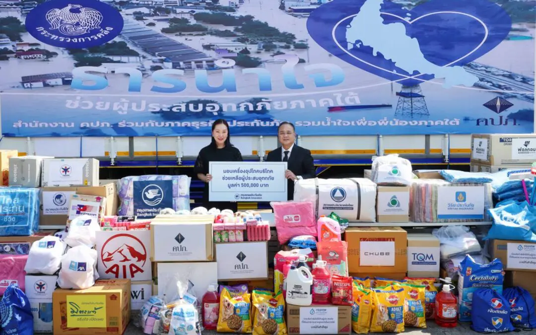 มูลนิธิชัย-นุชนารถ โสภณพนิช ร่วมกับบริษัท กรุงเทพประกันภัย จำกัด (มหาชน) โดยนางสาวลสา โสภณพนิช (ซ้าย) ผู้อำนวยการใหญ่ มอบเครื่องอุปโภคบริโภคมูลค่ารวม 500,000 บาท ซึ่งประกอบไปด้วย อาหารกึ่งสำเร็จรูป นมกล่อง ยาสามัญประจำบ้าน เครื่องนุ่งห่ม และของใช้ในชีวิตประจำวัน โดยมีนายชูฉัตร ประมูลผล (ขวา) เลขาธิการสำนักงานคณะกรรมการกำกับและส่งเสริมการประกอบธุรกิจประกันภัย (คปภ.) เป็นผู้รับมอบ เพื่อส่งต่อไปยังศูนย์อำนวยการช่วยเหลือเครือข่ายวายุภักษ์ กระทรวงการคลัง สำหรับนำไปช่วยเหลือผู้ประสบอุทกภัยในพื้นที่ภาคใต้ ณ ชั้น 1 อาคารสถาบันวิทยาการประกันภัยระดับสูง สำนักงาน คปภ. ถนนรัชดาภิเษก เมื่อวันที่ 3 ธันวาคม 2568