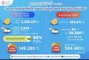 สร้างความมั่นคงในการอยู่อาศัยให้กับพี่น้องประชาชนในระยะยาว ตลอดจนเดินหน้าโครงการสินเชื่อเพื่อการพัฒนาที่อยู่อาศัย และปล่อยสินเชื่อแล้วกว่า 2,300 ล้านบาท ในปี 2569 การเคหะแห่งชาติได้จัดเตรียมวงเงินเพื่อปล่อยสินเชื่อให้กับประชาชนเพิ่มเติมอีกมากกว่า 594 ล้านบาท เพื่อรองรับความต้องการด้านที่อยู่อาศัย โดยเฉพาะในกลุ่มพี่น้องประชาชนที่ถูกปฏิเสธสินเชื่อจากสถาบันการเงิน เพื่อเพิ่มโอกาสและช่องทางในการเข้าถึงที่อยู่อาศัยให้ได้มากที่สุด ด้านการพัฒนาชุมชน การเคหะแห่งชาติมุ่งมั่นขับเคลื่อนโมเดล BCG และ ESG ใน 35 ชุมชนทั่วประเทศ เพื่อส่งเสริมการจัดการขยะ ลดมลภาวะ เพิ่มพื้นที่สีเขียว และสร้างความร่วมมือในชุมชนให้เข้มแข็งและยั่งยืน
