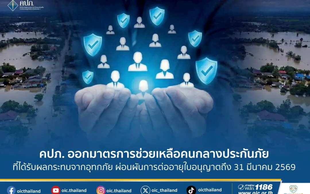 สำนักงานคณะกรรมการกำกับและส่งเสริมการประกอบธุรกิจประกันภัย (สำนักงาน คปภ.) ตระหนักถึงผลกระทบจากสถานการณ์อุทกภัยที่เกิดขึ้นในหลายพื้นที่ทั่วประเทศ โดยเฉพาะในช่วงปลายปีซึ่งเป็นฤดูมรสุมของภาคใต้ และยังเป็นช่วง        High Season ของธุรกรรมด้านประกันภัย อาจส่งผลให้ตัวแทนประกันภัยและนายหน้าประกันภัยไม่สามารถเข้ารับการอบรมหรือต่ออายุใบอนุญาตได้ภายในเวลาที่กำหนด