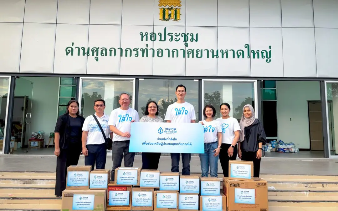 นอกจากนี้ กรุงเทพประกันชีวิตยังได้มอบสิ่งของจำเป็น อาหารพร้อมทาน และอุปกรณ์ทำความสะอาดให้กับสำนักงาน คปภ. ภาค 9 – สงขลา เพื่อกระจายไปยังผู้ที่เดือดร้อนในพื้นที่ พร้อมทั้งลงพื้นที่มอบถุงยังชีพบรรเทาทุกข์และให้กำลังใจแก่ลูกค้าในพื้นที่อำเภอหาดใหญ่อีกด้วย