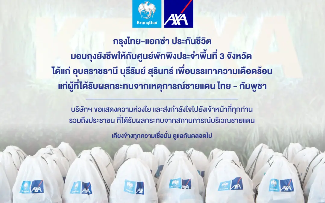 บมจ.กรุงไทย-แอกซ่า ประกันชีวิต ส่งมอบถุงยังชีพจำนวน 300 ชุด เพื่อช่วยเหลือประชาชนที่ได้รับผลกระทบจากสถานการณ์ชายแดนไทย-กัมพูชา โดยถุงยังชีพจะถูกส่งมอบให้ประชาชนผ่านศูนย์พักพิงประจำพื้นที่ 3 จังหวัด ได้แก่ จังหวัดอุบลราชธานี จังหวัดบุรีรัมย์และจังหวัดสุรินทร์ โดยทางบริษัทฯ ขอแสดงความห่วงใย และส่งกำลังใจไปยังเจ้าหน้าที่ทุกท่าน รวมถึงประชาชน ที่ได้รับผลกระทบจากสถานการณ์บริเวณชายแดน ทั้งนี้บริษัทฯ มุ่งมั่น เคียงข้างทุกความเชื่อมั่น ดูแลกันตลอดไป