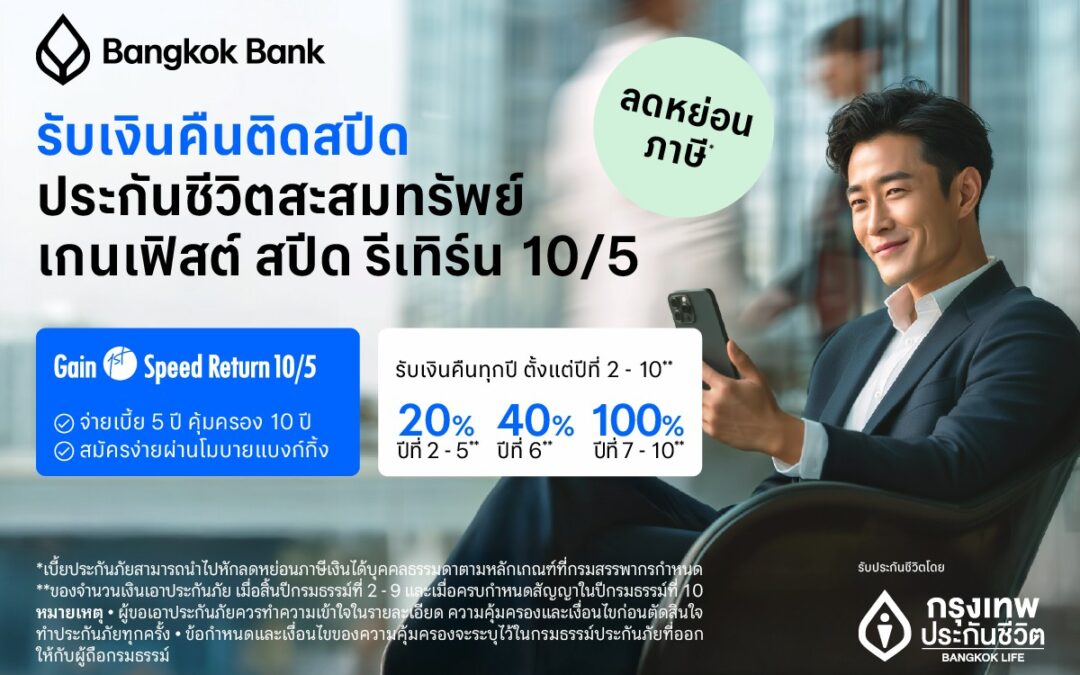 ประกันชีวิตสะสมทรัพย์ “เกนเฟิสต์ สปีด รีเทิร์น 10/5” ออกแบบให้เป็นเครื่องมือออมเงินระยะยาวที่ให้ผลตอบแทนแบบขั้นบันได ด้วยผลประโยชน์เงินคืนระหว่างสัญญาตั้งแต่ปีที่ 2 – ปีที่ 10 โดยปีที่ 2-5 รับเงินคืน 20%* ปีที่ 6 รับเงินคืน 40%* และปีที่ 7-10 รับเงินคืน 100%* รับผลประโยชน์รวมตลอดสัญญาสูงสุด 520%* ช่วยบริหารสภาพคล่องและสร้างแรงจูงใจในการออมอย่างมีวินัย โดยผู้ทำประกันชำระเบี้ยเพียง 5 ปี แต่ได้รับความคุ้มครองเต็มสัญญา 10 ปี ลดหย่อนภาษีสูงสุด 100,000 บาท รับประกันชีวิตโดยกรุงเทพประกันชีวิต สมัครผ่านโมบายแบงก์กิ้ง ธนาคารกรุงเทพ