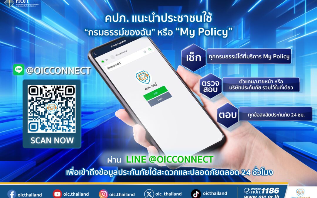 “สำนักงานคณะกรรมการกำกับและส่งเสริมการประกอบธุรกิจประกันภัย (สำนักงาน คปภ.) แนะนำให้ประชาชนและ ผู้เอาประกันภัยใช้บริการ OICConnect – “คปภ. รอบรู้” บน LINE Official Account ซึ่งเป็นช่องทางดิจิทัลสำหรับเข้าถึงข้อมูลและบริการด้านประกันภัยได้อย่างสะดวก รวดเร็ว และปลอดภัยตลอด 24 ชั่วโมง โดยเฉพาะในช่วงเวลาที่จำเป็นต้องตรวจสอบความคุ้มครอง สิทธิประโยชน์ หรือข้อมูลกรมธรรม์อย่างทันท่วงที เพื่อยกระดับการให้บริการประชาชนในรูปแบบดิจิทัล ทำให้ผู้เอาประกันภัยสามารถเข้าถึงข้อมูลกรมธรรม์ประกันภัยของตนเองได้ทันที ลดการพึ่งพาเอกสารฉบับจริง และเพิ่มความคล่องตัวในการจัดการข้อมูลด้านประกันภัยได้อย่างมีประสิทธิภาพ