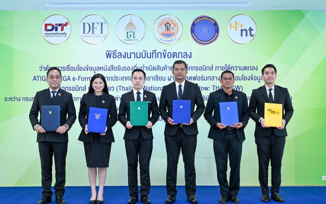 โดยมี นายพันธ์ทอง ลอยกุลนันท์ อธิบดีกรมศุลกากร นางอารดา เฟื่องทอง อธิบดีกรมการค้าต่างประเทศ นายวิทยากร มณีเนตร อธิบดีกรมการค้าภายใน นายสุวัฐน์ วงศ์สุวัฒน์ รองอธิบดีกรมประมง นายสัตวแพทย์รักไทย งามภักดิ์ รองอธิบดีกรมปศุสัตว์ และนายวงกต วิจักขณ์สังสิทธิ์ รองกรรมการผู้จัดการใหญ่ สายงานดิจิทัลและโซลูชัน บริษัท โทรคมนาคมแห่งชาติ จำกัด (มหาชน) ร่วมลงนาม โดยจากความร่วมมือในครั้งนี้ ทุกหน่วยงานมีแผนที่จะเปิดให้มีการเชื่อมโยงข้อมูลแหล่งกำเนิดสินค้าแบบอิเล็กทรอนิกส์ภายใต้ความตกลงการค้าสินค้าของอาเซียน หรือ ASEAN Trade in Goods Agreement (ATIGA e-Form D) ผ่านแพลตฟอร์มกลาง THAI NSW เพื่อให้หน่วยงานต่าง ๆ ที่เกี่ยวข้อง สามารถนำข้อมูลไปใช้ประกอบการออกใบอนุญาต รวมถึงใบรับรองได้อย่างสะดวก รวดเร็ว เพิ่มประสิทธิภาพในการบูรณาการข้อมูลระหว่างหน่วยงานภาครัฐและภาคธุรกิจ ทั้งนี้ แพลตฟอร์มกลาง THAI NSW มีการเชื่อมโยงแลกเปลี่ยนข้อมูลกับประเทศสมาชิกอาเซียนผ่าน ASEAN Single Window : ASW และหน่วยงานที่เกี่ยวข้องซึ่งก็มีการเชื่อมโยงกับแพลตฟอร์มกลาง THAI NSW อยู่ด้วยแล้ว
