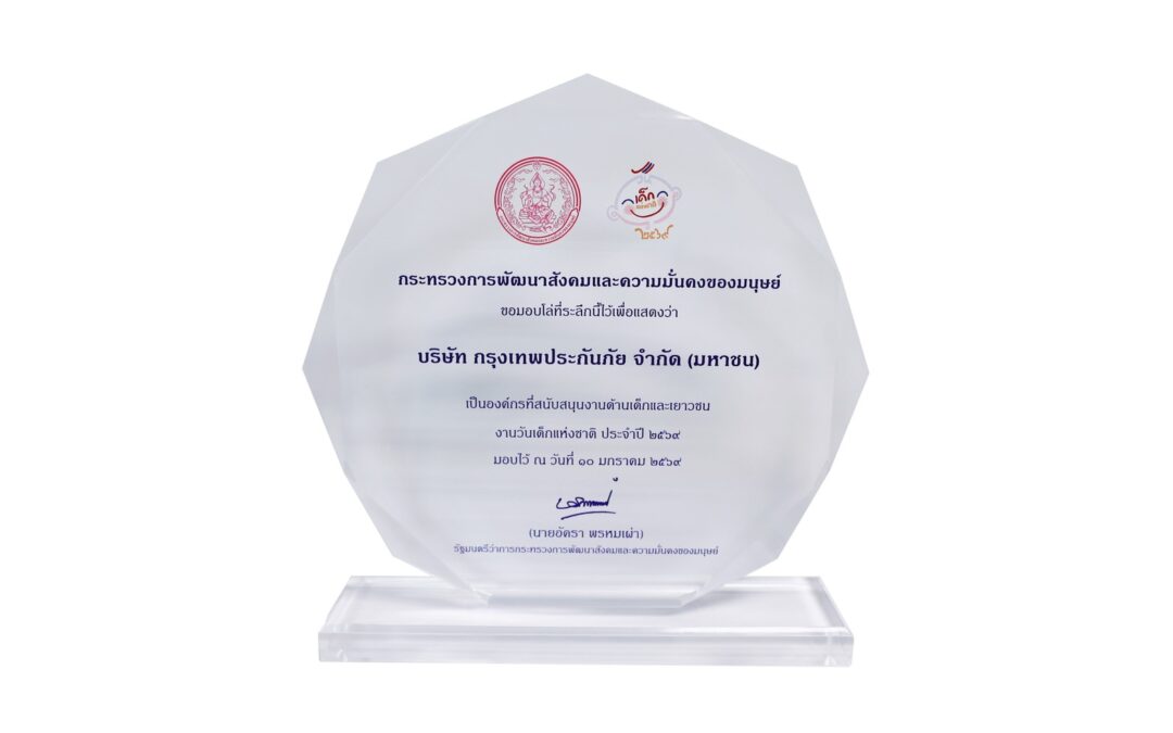 บริษัท กรุงเทพประกันภัย จำกัด (มหาชน) ได้รับรางวัลองค์กรที่สนับสนุนงานด้านเด็กและเยาวชน เนื่องในงานวันเด็กแห่งชาติ ประจำปี 2569 จากกรมกิจการเด็กและเยาวชน กระทรวงการพัฒนาสังคมและความมั่นคงของมนุษย์ โดยรางวัลดังกล่าวสะท้อนให้เห็นถึงการให้ความสำคัญและการมีส่วนร่วมของบริษัทฯ ในการสนับสนุน ส่งเสริม และพัฒนาศักยภาพของเด็กและเยาวชน เพื่อนำไปสู่การเติบโตที่เข้มแข็งและยั่งยืน ตลอดจนร่วมเสริมสร้างคุณภาพชีวิตที่ดีให้เด็กและเยาวชนด้วยการสร้างสภาพแวดล้อมที่เหมาะสมและสามารถใช้ชีวิตได้อย่างมีความสุข นับเป็นอีกหนึ่งความภาคภูมิใจที่ตอกย้ำถึงความรับผิดชอบต่อสังคมขององค์กรอย่างต่อเนื่อง