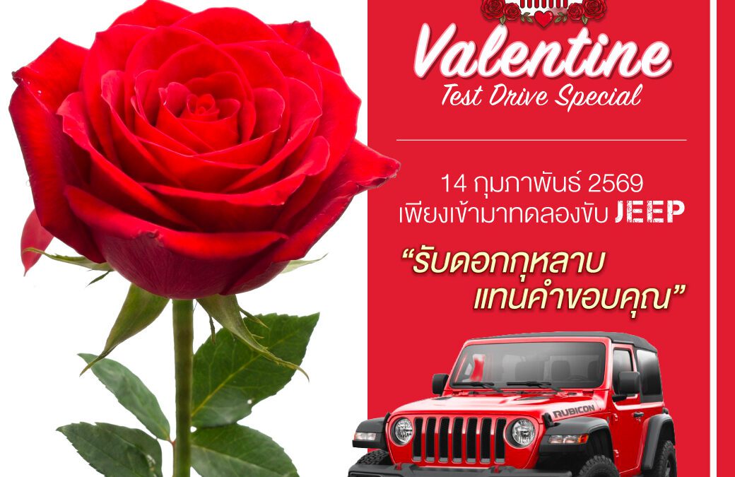 และวาเลนไทน์ พร้อมเชิญชวนสัมผัส จี๊ป รุ่นไฮไลท์ อย่าง แรงเลอร์ รูบิคอน และ กลาดิเอเตอร์ รูบิคอน ที่มาพร้อมการขยายระยะเวลาการรับประกันคุณภาพสูงสุดถึง 7 ปี อีกทั้งอุปกรณ์ตกแต่งแท้มูลค่าสูงสุด 1 ล้านบาท พิเศษเมื่อทดลองขับและจองรถภายในงาน รับข้อเสนอสุดคุ้ม พร้อมอั่งเปาและส้มมงคลรับตรุษจีน เพื่อความเป็นสิริมงคลในการเริ่มต้นปีใหม่”