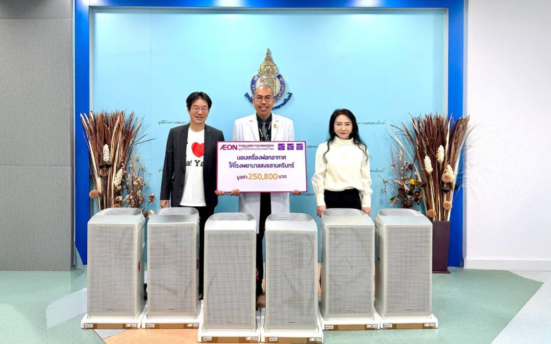 มูลนิธิอิออนประเทศไทย นำโดย นางสุพร วัธนเวคิน (ขวา) ประธานมูลนิธิอิออนประเทศไทย และนายโทชิยะ ชิมะคะตะ (ซ้าย) กรรมการผู้จัดการ บริษัท อิออน ธนสินทรัพย์ (ไทยแลนด์) จำกัด (มหาชน) มอบเครื่องฟอกอากาศ จำนวน 12 เครื่อง รวมมูลค่า 250,800 บาท แก่โรงพยาบาลสงขลานครินทร์ โดยมี ศ.นพ. รังสรรค์ ภูรยานนทชัย (กลาง) รองคณบดีฝ่ายโรงพยาบาลและผู้อำนวยการโรงพยาบาลสงขลานครินทร์ เป็นผู้รับมอบ การสนับสนุนนี้เพื่อช่วยยกระดับคุณภาพอากาศภายในสถานพยาบาล ลดปริมาณฝุ่นละออง PM 2.5 และมลพิษทางอากาศที่ส่งผลกระทบโดยตรงต่อสุขภาพของผู้ป่วย รวมถึงประสิทธิภาพการปฏิบัติงานของบุคลากรทางการแพทย์ เป็นการสร้างสภาพแวดล้อมที่ดีและเอื้อต่อการเน้นย้ำพันธกิจของมูลนิธิอิออนประเทศไทยในการพัฒนาสังคมไทยให้เติบโตอย่างเข้มแข็งและยั่งยืน ที่รวมถึงการสนับสนุนระบบสาธารณสุข และยกระดับคุณภาพชีวิตของประชาชนไทยในทุกมิติ