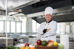 Confident senior Asian chef man in dress uniform standing and arms crossed with various vegetables in kitchen restaurant. Cooking and food concept