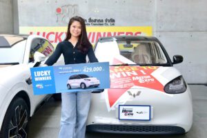 ชไมพร ปภัสร์พงษ์ รองประธานจัดงาน ควบคุมงานด้านการตลาดสัมพันธ์ มอบรางวัลรายการ “ชมงานผ่าน MOTOR EXPO APP ชิงรถ” WULING BINGUO รุ่น DC ICON มูลค่า 429,000 บาท ผู้ได้รับรางวัล ได้แก่ กมลพร ชลไชยะ จังหวัดร้อยเอ็ด