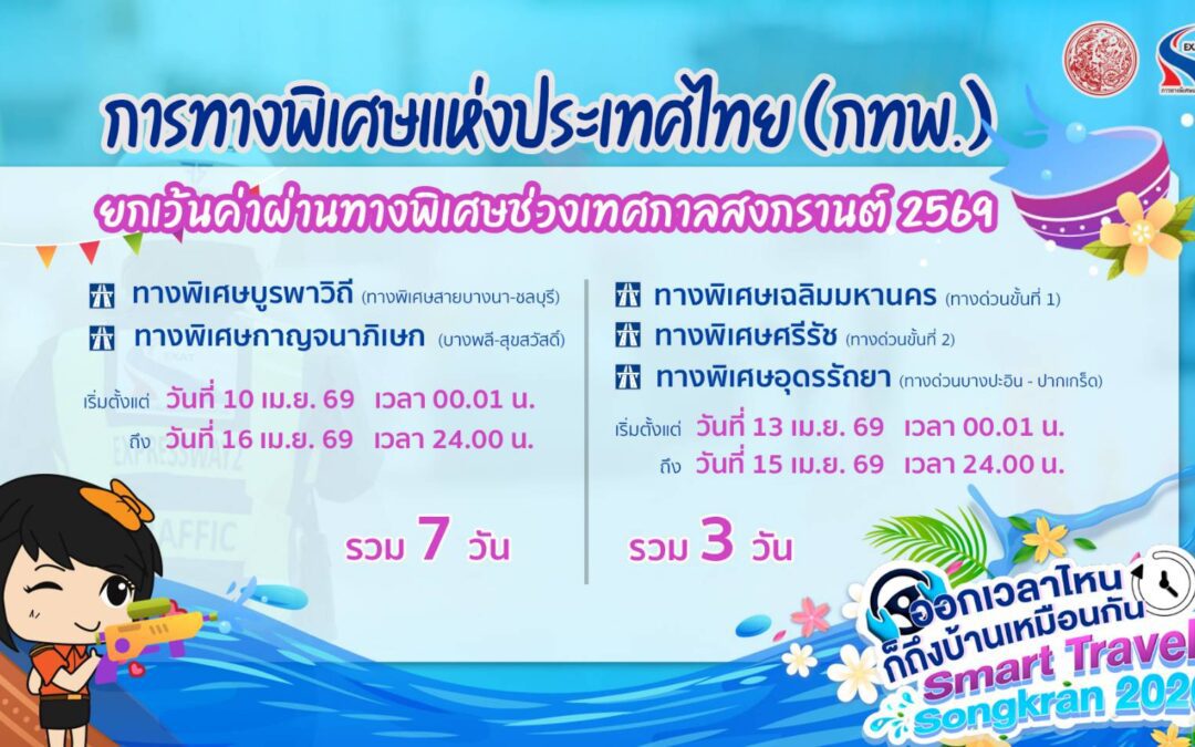 การทางพิเศษแห่งประเทศไทย (กทพ.) กระทรวงคมนาคม ยกเว้นค่าผ่านทางพิเศษช่วงเทศกาลสงกรานต์ ตามนโยบาย “Smart Travel Songkran 2569 ออกเวลาไหนก็ถึงบ้านเหมือนกัน” โดยมุ่งอำนวยความสะดวกและลดภาระค่าใช้จ่ายให้กับประชาชนในช่วงเทศกาลสงกรานต์ ประจำปี 2569 สนับสนุนการเดินทางของประชาชนให้มีความคล่องตัว รวดเร็ว และปลอดภัย
