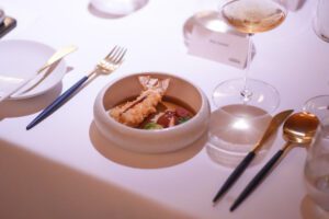 The Art of Fine Wine: A Private Dinner เป็นกิจกรรมแทนคำขอบคุณกลุ่มลูกค้าคนสำคัญที่ให้ความไว้วางใจในบริการทางการเงินและความคุ้มครอง “ความใส่ใจ” ถูกถ่ายทอดผ่านการคัดสรรร้านอาหารภายใต้บรรยากาศอบอุ่นกลิ่นอายสไตล์ฝรั่งเศสที่ “บ้านของดูนัง” ร้านอาหารสไตล์ Fine Dining ของ “เชฟอาโน ดูนัง” ที่นำเสนออาหารฝรั่งเศสร่วมสมัย และคว้าดาวมิชลิน The MICHELIN Guide Thailand 2023 1 ดวง และ เชฟอาโน ยังเป็นอดีตหัวหน้าเชฟร้านอาหารระดับมิชลินสตาร์ดาว 2 ดวง ที่ Le Normandie สำหรับมื้อค่ำในงานนี้เชฟได้รังสรรค์เมนู 6 คอร์สที่เต็มไปด้วยความพิถีพิถัน สีสัน รสชาติ และประสบการณ์ที่บ่งบอกตัวตนและความใส่ใจในทุกจาน