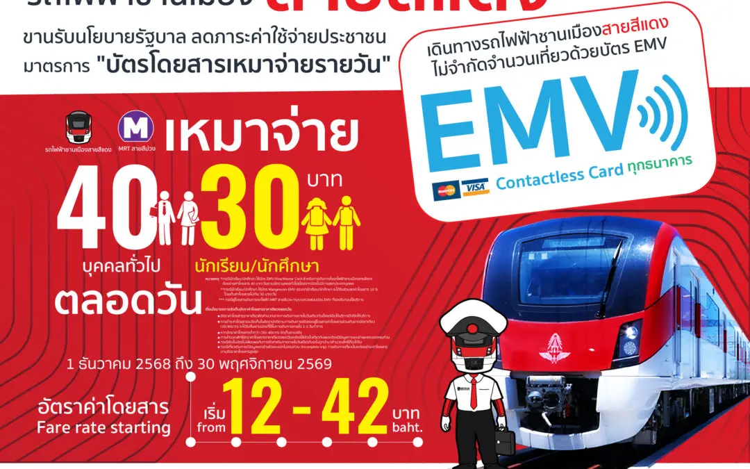 นายสุเทพ พันธุ์เพ็ง กรรมการผู้อำนวยการใหญ่ บริษัท รถไฟฟ้า ร.ฟ.ท. จำกัด ผู้ให้บริการรถไฟฟ้าชานเมืองสายสีแดง เปิดเผยว่า รฟฟท. พร้อมดำเนินการตามนโยบายรัฐบาล เพื่อช่วยลดภาระค่าใช้จ่ายให้แก่ประชาชน ”ดำเนินมาตรการ “บัตรโดยสารเหมาจ่ายรายวัน” สำหรับรถไฟชานเมืองสายสีแดง ทั้ง 2 เส้นทาง ได้แก่ สายธานีรัถยา ช่วงสถานีกลางกรุงเทพอภิวัฒน์ – สถานีรังสิต และสายนครวิถี ช่วงสถานีกลางกรุงเทพอภิวัฒน์ – สถานีตลิ่งชัน ร่วมกับ รถไฟฟ้ามหานคร สายฉลองรัชธรรม (MRT สายสีม่วง) โดยเตรียมจัดเก็บค่าโดยสารสูงสุด 40 บาท/วัน สำหรับประเภทบุคคลทั่วไป(Adult) และจัดเก็บค่าโดยสารสูงสุด 30 บาท/วัน สำหรับประเภทนักเรียน/นักศึกษา(Student) ซึ่งใช้บัตร MANGMOOM EMV บัตร EMV Contactless (บัตรเครดิต บัตรเดบิต) หรือ บัตร MRT EMV สำหรับเดินทางได้ทุกวัน ตั้งแต่เปิดให้บริการจนถึงปิดให้บริการ(05.00 – 24.00 น.) ซึ่งนโยบายดังกล่าวจะเริ่มใช้ตั้งแต่ วันที่ 1 ธันวาคม 2568 – 30 พฤศจิกายน 2569 หากผู้ใช้บริการมีการเดินทางในอัตราค่าโดยสารรวมทั้งวันต่ำกว่าอัตราเหมาจ่ายรายวัน จะจัดเก็บค่าโดยสารตามจริง และสำหรับกลุ่มผู้พิการ ผู้สูงอายุ เด็ก รวมถึงกลุ่มผู้ใช้สิทธิ์สวัสดิการแห่งรัฐ ยังคงได้รับส่วนลด หรือยกเว้นค่าโดยสารตามสิทธิประโยชน์เช่นเดิม